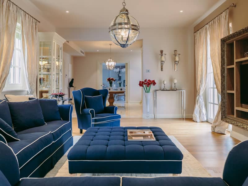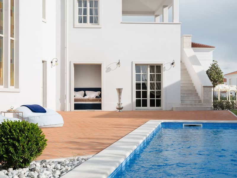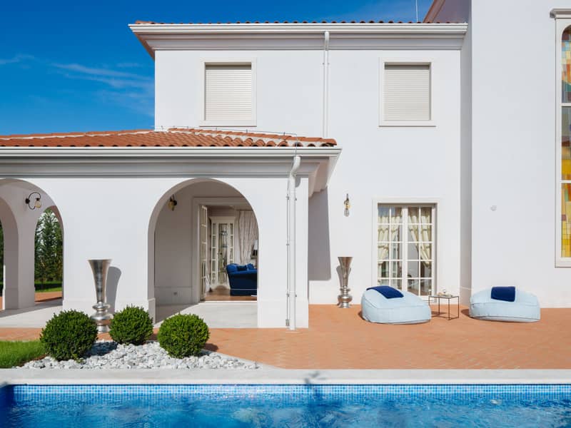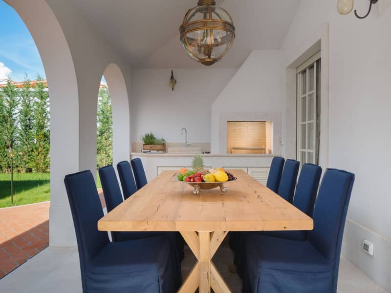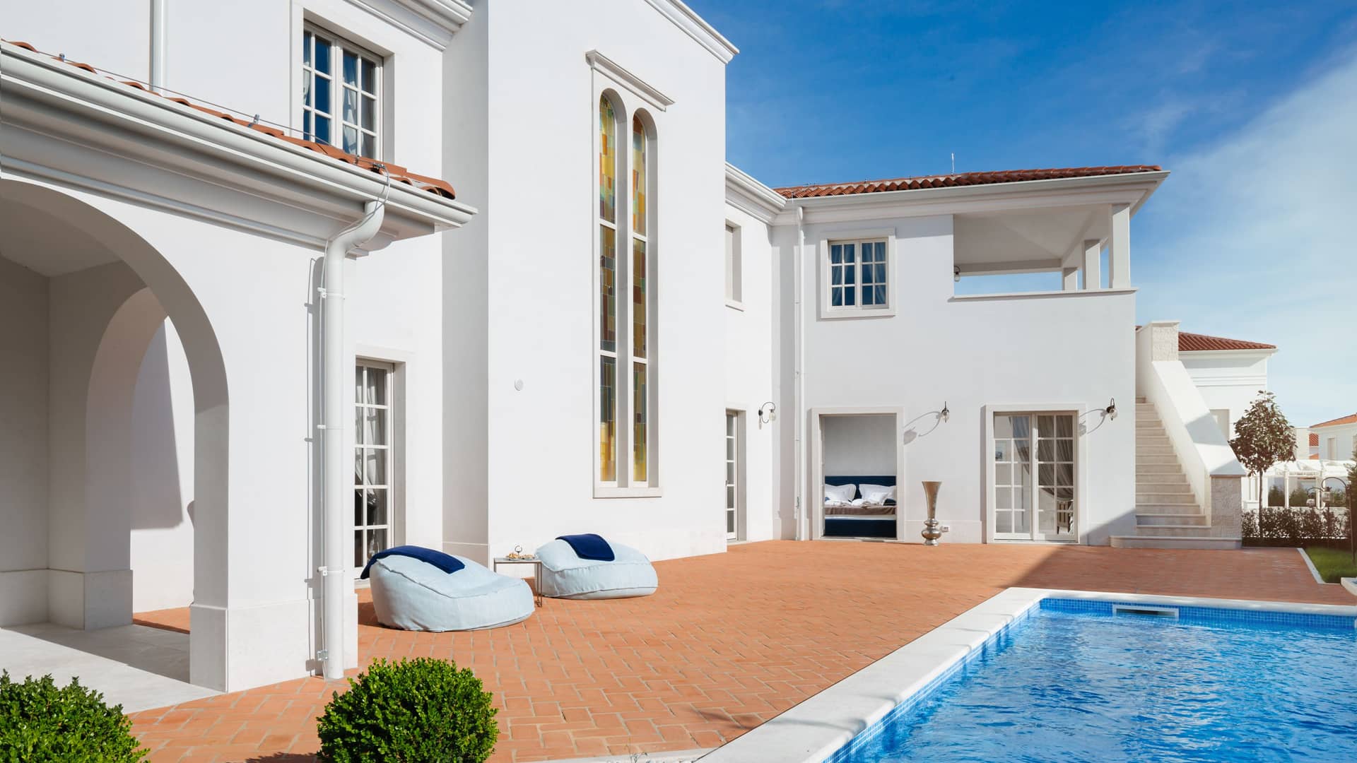The outdoor area includes a private swimming pool, sun loungers, and cozy lounge areas. A covered terrace with a summer kitchen, barbecue, and outdoor dining area is perfect for enjoying warm evenings.